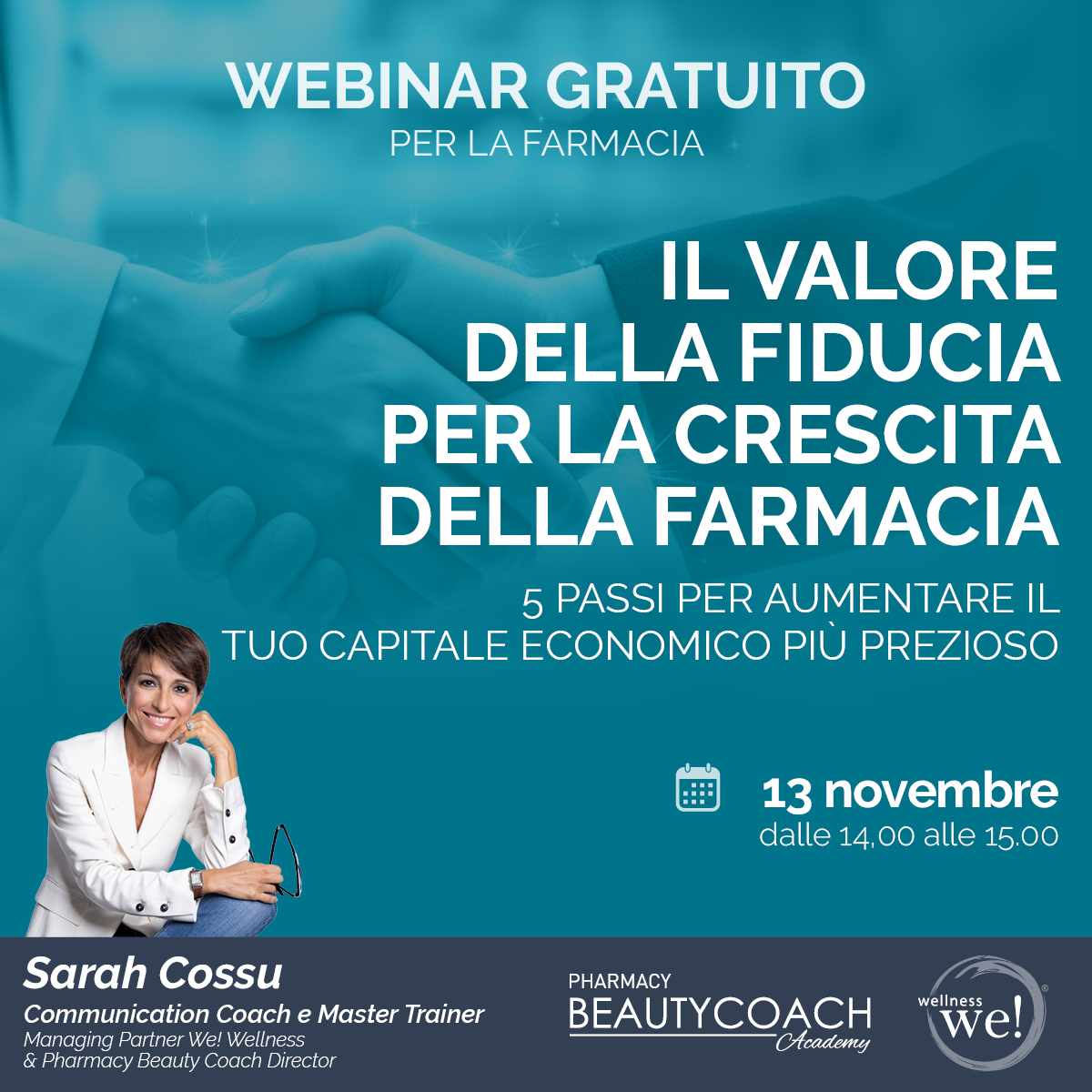 Iscriviti al webinar gratuito con Sarah Cossu, massima esperta per la vendita consulenziale in farmacia.
